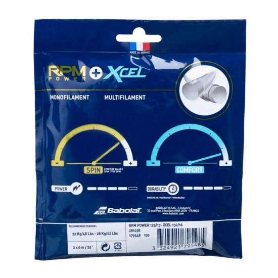 The RPM Power offers even more power and spin when coupled with the Xcel multifilament string. Dispose it on mains strings to optimize its benefit.