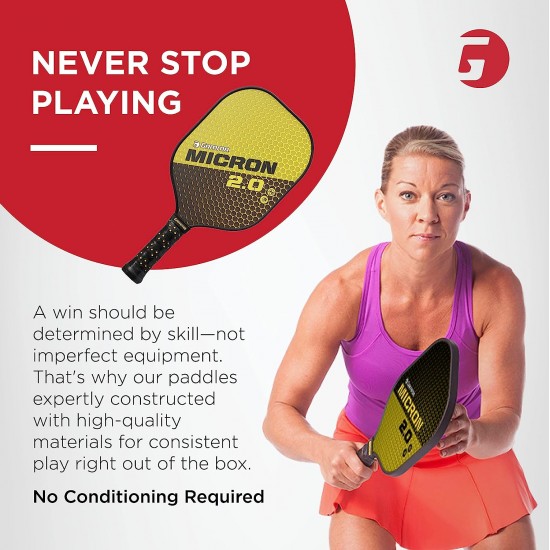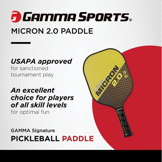 The GAMMA Micron 2.0 pickleball paddle is the perfect paddle for those wanting a mid-weight paddle, ample sized face and a smaller grip. The paddle is designed with a textured fiberglass face and a composite core providing a crisp feel and good control. This is a great value paddle for players at any level.